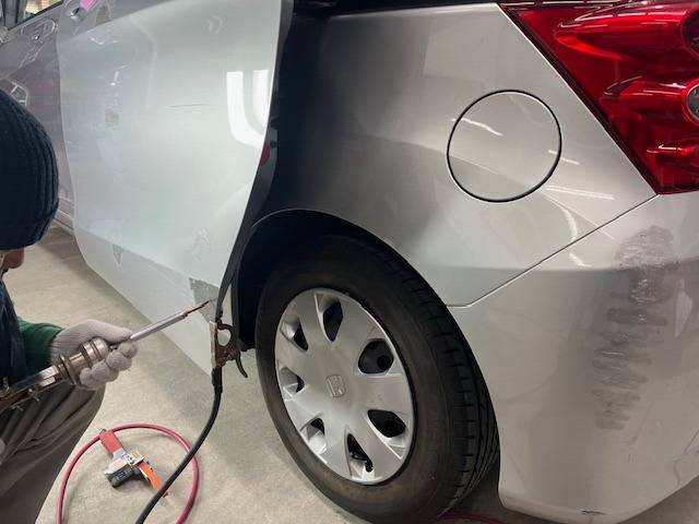 フリード左側面修理 2026/03/26 フリード左側面修理 板金修理中 今回のお客様はフリード!🚗 左側にキズへこみが多く、修理依頼がありました。 左サイドミラー、左ドア2枚、リアバンパー、リアドア、リアフェンダー計6か所の大掛かりな修理になります😢 一番損傷の大きい箇所の板金修理中の写真です 極限までドアの鉄板を出しています👍 フリード左側面修理 板金修理中 この後、パテ成型、パテ研ぎ、サーフェーサー塗装 サーフェーサー研ぎ、塗装と作業工程が続きます😊 本来なら板金と塗装は分かれて作業をするのですが、当店では熟練の職人1人での作業になります🛠️ 一人での全作業になるためどうしても予約制になってしまい、お時間がかかる場合もございます。 ご了承ください😌😌 八尾市で自動車板金塗装屋さんをお探しの方は ARYオートリペアへご相談を!! お車のことならお役に立てるかもしれません😊😊 施工事例